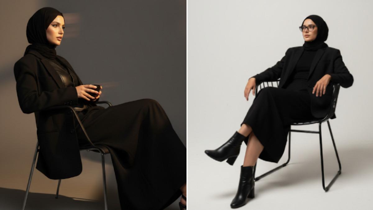 - “Jadikan foto di studio, tanpa mengubah wajah, menampilkan seorang wanita muda yang duduk santai di kursi lipat logam dengan posisi kaki bersilang. Ia mengenakan blazer hitam, hijab hitam, rok panjang hitam, dan sepatu boots hitam. Pencahayaan lembut dan minim, menghasilkan bayangan tegas dan suasana moody. Pose tubuh rileks, sedikit bersandar dengan satu tangan di sandaran kursi, wajah menoleh kesamping. Latar polos, estetika sederhana dan modern.”