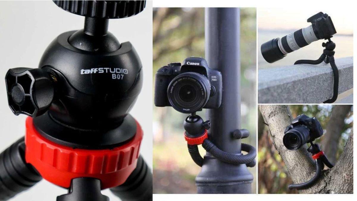 TaffSTUDIO B07 merupakan mini tripod yang dirancang khusus untuk penggunaan pada HP atau kamera. Kaki fleksibelnya menyerupai gurita, sehingga bisa berdiri di permukaan yang tidak rata. Soket universal 1/4 inch memungkinkan penggunaan pada berbagai jenis kamera atau DSLR. Materialnya terbuat dari plastik ringan namun kokoh. Panjangnya sekitar 30 cm, dengan harga sekitar Rp 49.900.