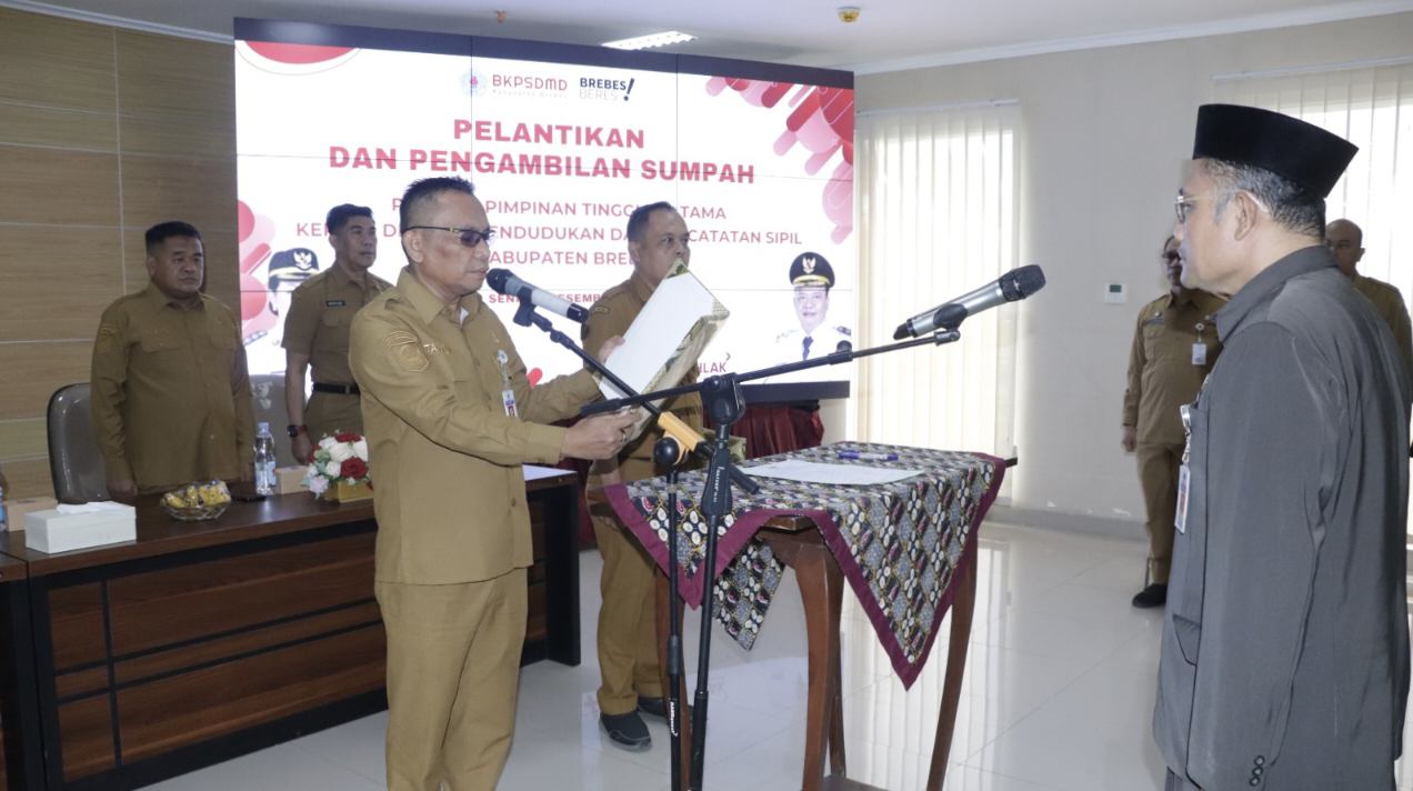 BREBES – Pemerintah Kabupaten Brebes kembali melakukan penguatan struktur kepegawaian melalui pelantikan dan pengambilan sumpah Jabatan Pimpinan Tinggi Pratama (JPTP) Kepala Dinas Kependudukan dan Pencatatan Sipil (Dindukcapil) Kabupaten Brebes.