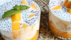 8. Tuang jus mangga ke dalam gelas bening, beri ruang di bagian atas. Tambahkan whipped cream, lalu tutup dengan topping mangga potong dadu.