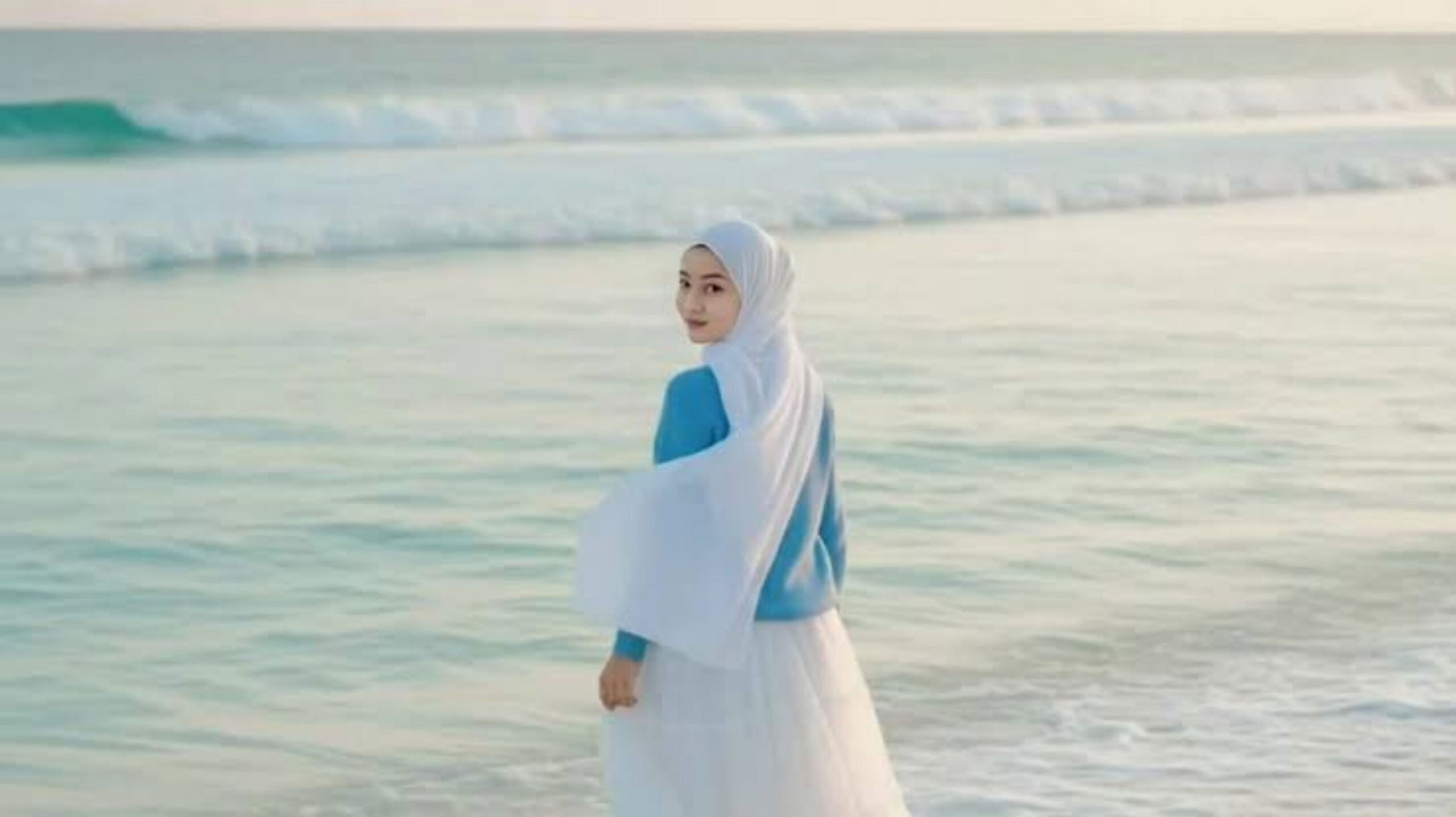 Edit foto tanpa mengubah wajah, menjadi potret berhijab dengan pashmina putih yang menjuntai dan dress flowy berwarna biru muda yang bergerak tertiup angin lembut. Ia berdiri anggun di tepi danau dengan cahaya matahari sore yang memantul di permukaan udara, hasilnya tampak alami bergaya candid.