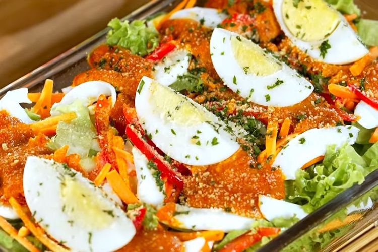 Salah satu variasi yang menarik adalah salad sayur dengan dressing telur yang memberikan rasa gurih dan kaya akan protein.
