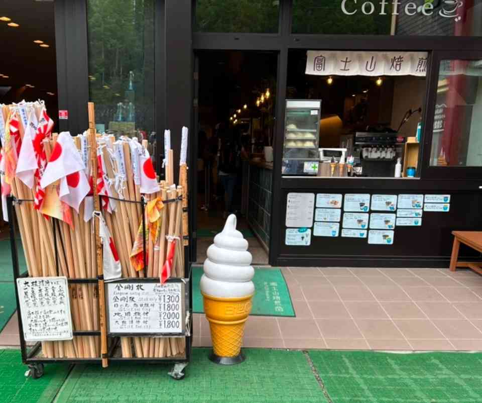 Di depannya, berdiri patung perunggu pendaki, replika es krim raksasa, dan tongkat-tongkat dengan bendera Jepang. Di sisi lain, hiasan suvenir bergambar jagung dan replika kotak pos merah menyala memberi warna ceria di tengah kabut gunung.