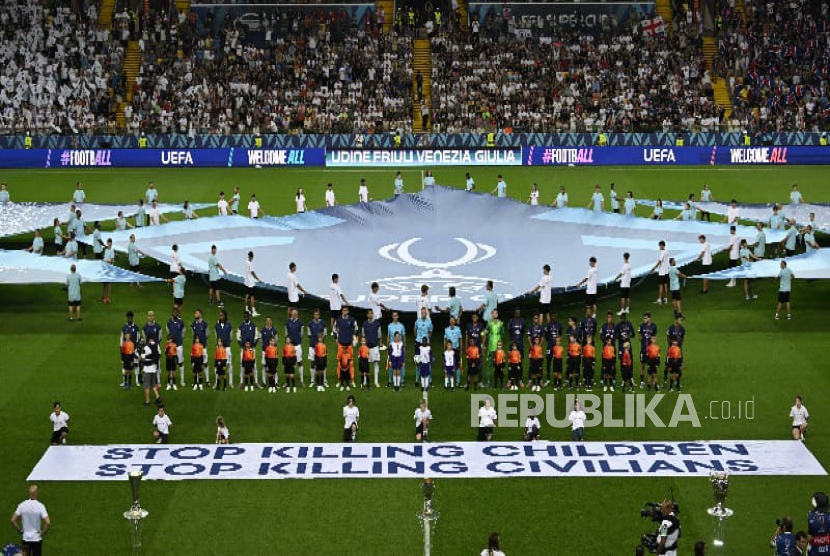Pertandingan yang digelar di Udine, Italia, pada dini hari WIB tanggal 13 Agustus 2025, disaksikan oleh jutaan penggemar sepak bola. Dalam momen penting tersebut, spanduk putih dengan tulisan biru dipajang di lapangan saat para pemain dari kedua tim keluar. Ini menjadi langkah yang didukung oleh UEFA, badan pengatur sepak bola Eropa.